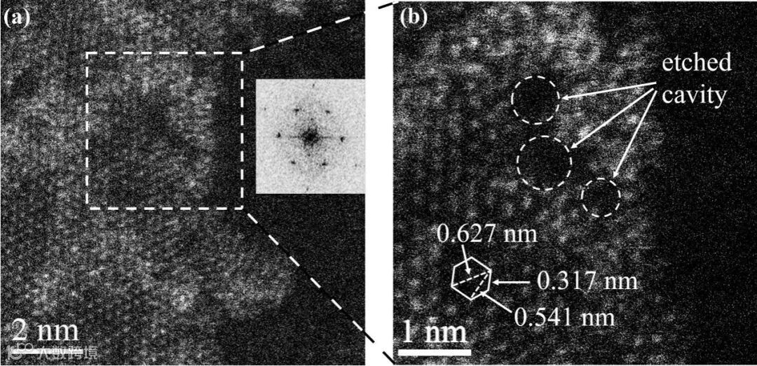 图 3 MBene的STEM-HAADF图像及相应的快速傅里叶变换(插图)