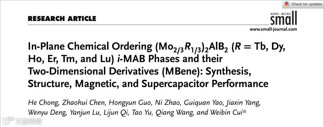 近日,东北大学EPM教育部重点实验室崔伟斌教授团队在Small期刊发表了题为 “In-Plane Chemical Ordering (Mo2/3R1/3)2AlB2 (R = Tb, Dy, Ho, Er, Tm and Lu) i-MAB Phases and their Two-dimensional Derivatives (MBene):Synthesis,Structure,Magnetic and Supercapacitor Performance”的研究论文。该文章中合成了六种稀土原子有序占位的(Mo2/3R1/3)2AlB2 (R = Tb, Dy, Ho, Er, Tm, Lu) i-MAB相,并对其结构和磁性进行研究。通过湿化学法选择性刻蚀了Al原子层和R原子,得到具有R空位的二维MBene。