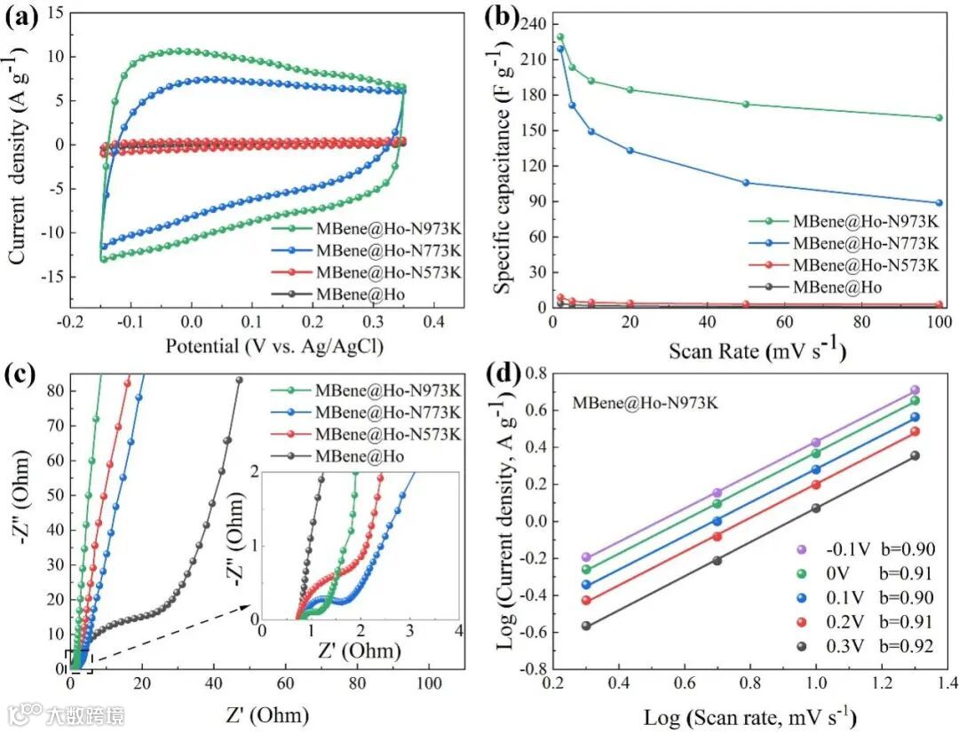 图 4 MBene@Ho, MBene@Ho-N573K, MBene@Ho-N773K, MBene@Ho-N973K (a)在50mV/s扫速下的CV曲线,(b)质量比电容,(c)Nyquist图,(d) MBene@Ho-N973K的b值拟合结果