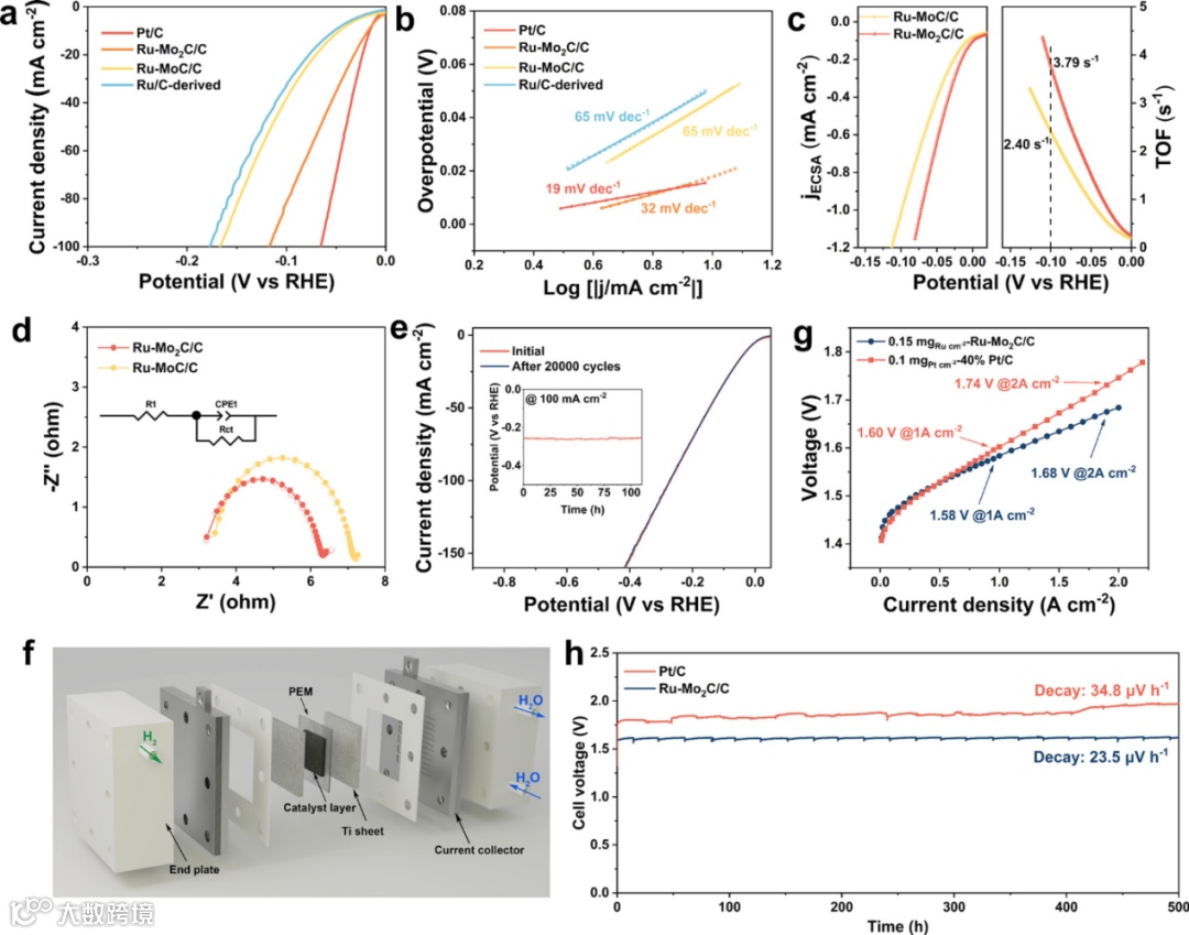 Ru-Mo2C比Ru-MoC有着更好的HER活性,其具有更小的Tafel斜率、更高的本征活性jECSA、更大的交换电流密度j0和更小的Rct,并且有着优异的稳定性。将优化的Ru-Mo2C催化剂组装成PEM器件,在0.15mgRu cm-2的载量下,有着出色的性能,分别在1.58和1.68 V的低槽压下达到1和2 A cm-2的高电流密度,并且能在1A cm-2下稳定运行超过500 h。