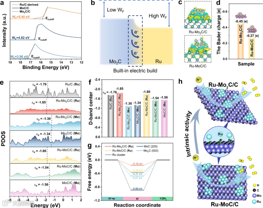 紫外光电子能谱(UPS)测试证明Mo2C有着更低的功函数(3.96 eV),相比于MoC(4.62 eV)理论上更容易转移电子给Ru(5.40 eV)。理论计算同样证明了Ru-Mo2C催化剂中的Ru比Ru-MoC中的Ru从载体得到了更多的电子,并且具有更适宜的d带中心,更趋近于0的ΔGH*,从而提高了HER的活性。