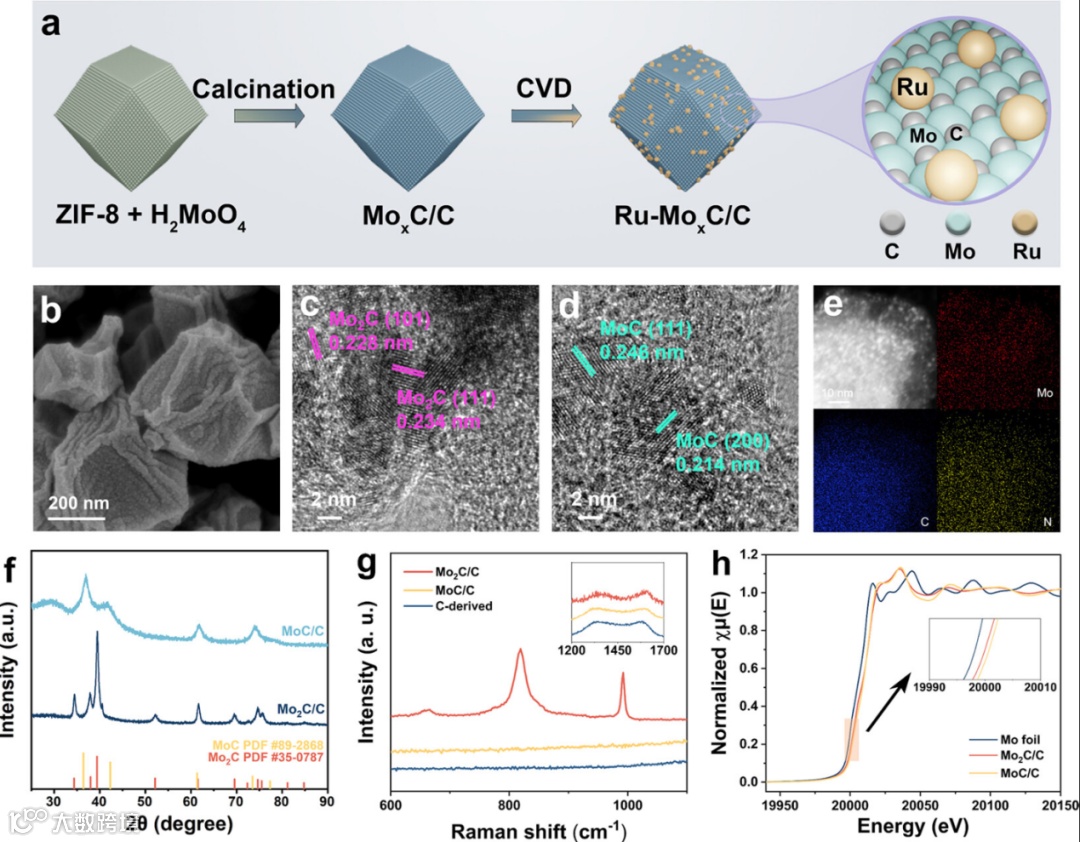 利用CVD的方法负载Ru团簇于不同晶相的碳化钼上。选用易挥发的乙酰丙酮钌金属盐,通过化学气相沉积将Ru团簇高度分散在两种不同的碳化钼载体上,Ru和MoxC存在金属-载体相互作用,由于两种MoxC载体的物理化学性质不同,Ru的电子结构得到了不同作用的调控。