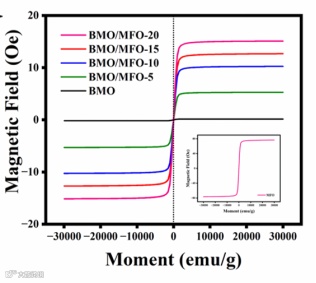 Bi2MoO6-SOVs的磁性很弱,与具有磁性的铁镁氧体复合后磁性大大提高。这表明在半导体复合过程中保持了MgFe2O4的原始磁性。借助磁性回收使用后的粉末催化剂,通过比较使用前后催化剂的质量,发现粉末样品的回收效率高达99%。这表明半导体催化剂具有磁性,极大地改善了传统粉末催化剂难以回收的缺点。