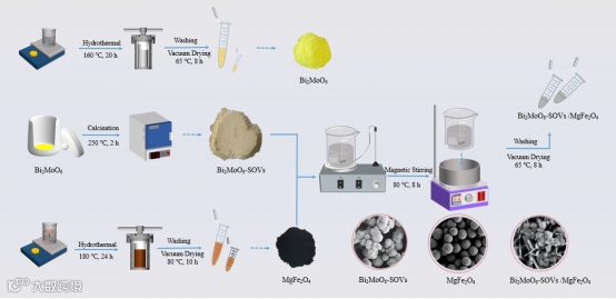 图1. 具有磁性的Bi2MoO6-SOVs/MgFe2O4 纳米球合成过程图