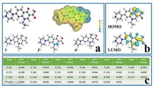 图4. NOR的(a)化学结构、局部电子密度、f-、f+和f0;(b) HOMO和LUMO轨道和(c) 原子NPA电荷