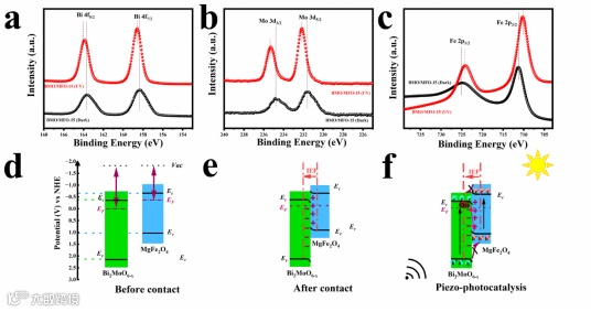 图2. 黑暗和紫外光照下的ISI-XPS光谱:(a)Bi 4f, (b) Mo 3d, (c) Fe 2p; BMO/MFO-15的S型电荷转移机制:(d, e) 两半导体材料接触前后, (f)压电光催化。