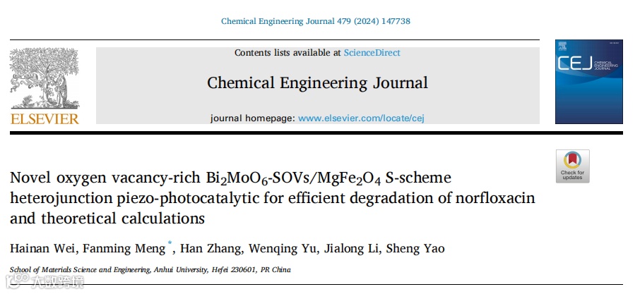 近日,来自安徽大学的孟凡明教授,在国际知名期刊Chemical Engineering Journal上发表题为“Novel oxygen vacancy-rich Bi2MoO6-SOVs/MgFe2O4 S-scheme heterojunction piezo-photocatalytic for efficient degradation of norfloxacin and theoretical calculations”的观点文章。该观点将表面缺陷应用到催化剂中,在未破坏催化剂形貌的前提下大大提高了降解效率。同时使催化剂具有磁性,从而可高效回收传统粉末样品,达到循环使用的目的。
