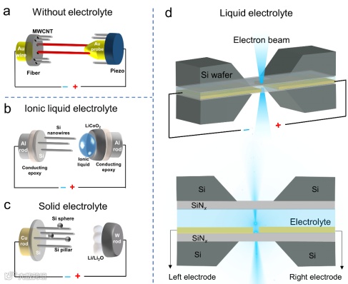 要进行原位电化学TEM 实验,需要一个可插入TEM腔体并与外部恒电位仪连接的合适电化学电池。根据所用电解质的类型和状态,可采用不同的电化学电池平台,如无电解液电池、非挥发性电解液电池和液态电解液电池。每种平台在研究电池电化学反应的不同方面都有其自身的优势和局限性。开放式样品池和液态样品池的选择取决于实验目的:如果要求空间分辨率高且光束影响最小,则应选择开放式样品池。如果需要真实再现电化学界面,液态池则必不可少。通过结合这些模式,研究人员可以全面了解潜在的电化学动力学。
