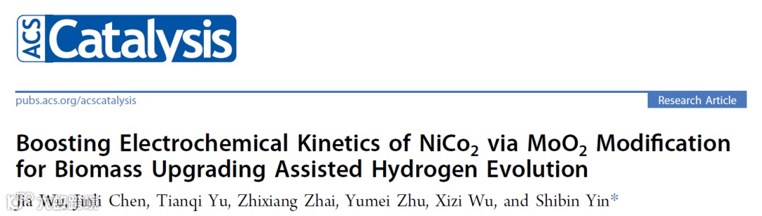近日,尹诗斌教授团队在国际知名期刊《ACS Catalysis》发表题为“Boosting Electrochemical Kinetics of NiCo2 via MoO2 Modification for Biomass Upgrading Assisted Hydrogen Evolution”的研究论文(DOI:10.1021/acscatal.3c03094)。该工作通过在NiCo2纳米线骨架表面可控生长厚度为2~4纳米的MoO2层,有效地调控了NiCo2@MoO2/NF的电子结构,从而加速了HMFOR过程中的电子/质子转移,并优化HMFOR和HER中间体的吸附行为,最终实现了高效的生物质氧化辅助析氢。