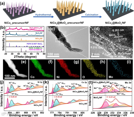 图1.(a)NiCo2@MoO2/NF的合成路线示意图;(b)XRD图谱;(c)TEM图像;(d)HRTEM图像;(e)HAADF-STEM图像;(f-i)EDX元素映射图像;(j-l)XPS图谱。