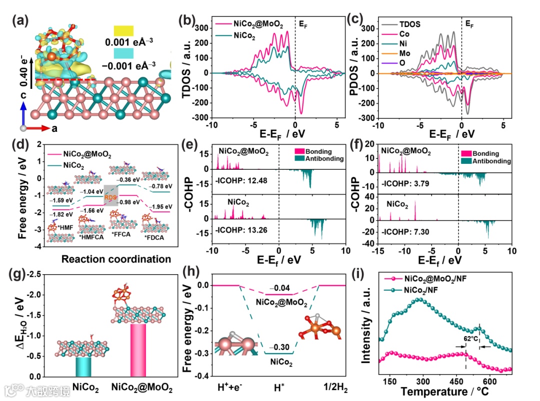 图3.(a-c)NiCo2@MoO2的电荷差分密度、TDOS和PDOS;(d)HMFOR自由能曲线;(e-f)HMFCA中C‒H和O‒H键的‒COHP;(g-h)H2O和H*的吸附能;(i)H2-TPD谱图。