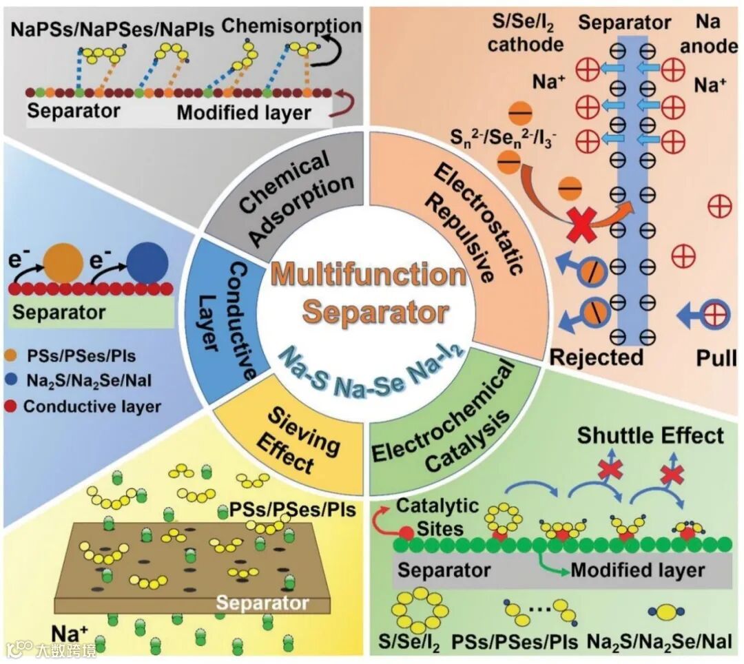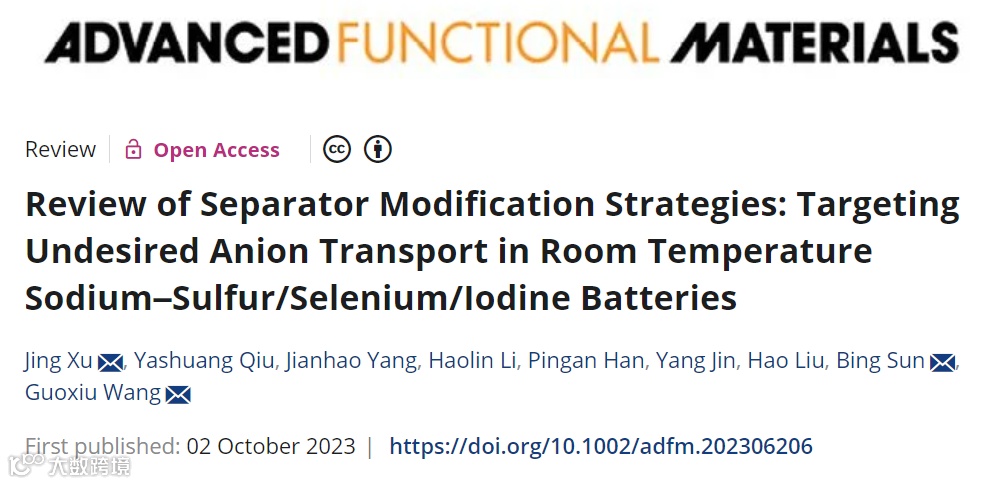近日,郑州大学徐晶副教授联合悉尼科技大学汪国秀教授、孙兵研究员,在国际知名期刊Advanced Functional Materials上发表题为“Review of Separator Modification Strategies: Targeting Undesired Anion Transport in Room Temperature Sodium–Sulfur/Selenium/Iodine Batteries”的文章。文章全面回顾了高性能Na-S/Se/I2电池隔膜改性的最新成果,同时讨论了每类电池体系的反应机理并总结了基于不同功能隔膜调控PSs/PSes/PIs输运的改性策略,包括应用静电排斥作用、引入导电层、改善筛分效果、增强化学吸附能力、添加高效电催化剂等。
