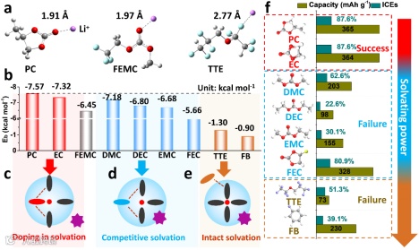 图5. 掺杂原理的理论研究。(a)优化配位结构;(b)不同溶剂与Li+的结合能;(c)溶剂化层中的掺杂示意图;(d)溶剂化层中竞争示意图和(e)不受影响的溶剂化层。(f) 锂/石墨电池在不同电解液中ICEs和可逆的容量 (LiPF6/掺杂剂/FEMC摩尔比为1:1:9)