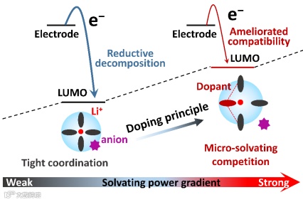 图1. 溶剂化结构掺杂提升电解液LUMO能级原理