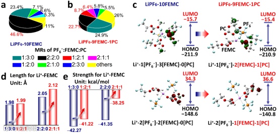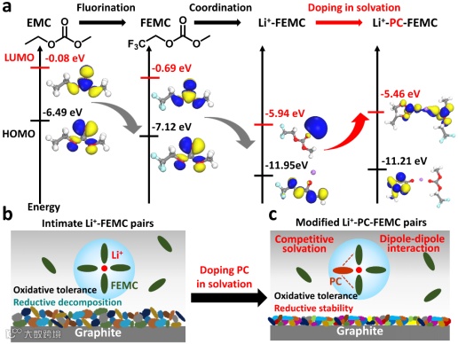 相比于碳酸甲乙酯(EMC),甲基三氟乙基碳酸酯(FEMC)由于F的强吸电子性导致LUMO和HOMO能级降低,在提升氧化稳定性的同时牺牲了还原稳定性。在电解液中,FEMC与锂离子络合,进一步导致LUMO能级的降低,因而纯FEMC基电解液在石墨表面持续分解,造成电池产气和失效。当向FEMC主导的溶剂化层中引入少量PC,能显著提升络合物的LUMO能级,提升电解液的还原稳定性,因而基于PC掺杂改性的FEMC基电解液在石墨表面实现了可逆的锂离子脱嵌。
