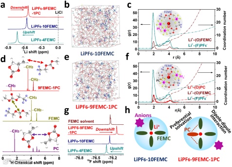 图3. 溶剂化结构和分子相互作用。(a)7Li-NMR谱;(b)LiPF6-10FEMC电解液的AIMD结果和(c)RDFs;(d)不同溶剂的1H-NMR谱;(e) L9F1P的AIMD结果和(f)RDFs;(g)19F-NMR结果;(h) 不同电解液的溶剂化结构示意图。