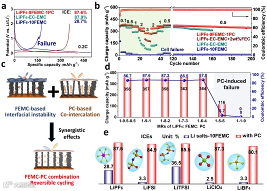 图2. 电解液的设计及电化学表征。(a)初始锂/石墨半电池的充放电曲线和(b)倍率能力;(c)PC-FEMC组成的协同效应示意图;(d)不同FEMC/PC摩尔比下锂/石墨半电池的可逆容量和ICEs;(e)不同锂盐下PC-FEMC配方中锂/石墨半电池的ICEs。