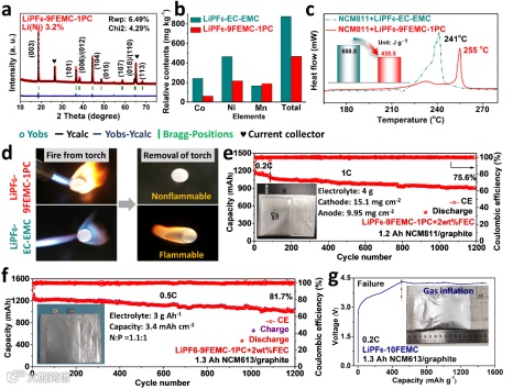 图6. 电解质特性及其实际应用。(a) 循环后NCM电极片Rietveld精修结果;(b)过渡金属溶出结果;(c)脱锂态NCM811与电解液的DSC结果和放热量;(d)电解液燃烧性测试;(e) NCM811/石墨和(f) NCM613/石墨软包电池在L9F1P中的长循环稳定性。(g)LiPF6-10FEMC导致软包电池的失效和胀气。