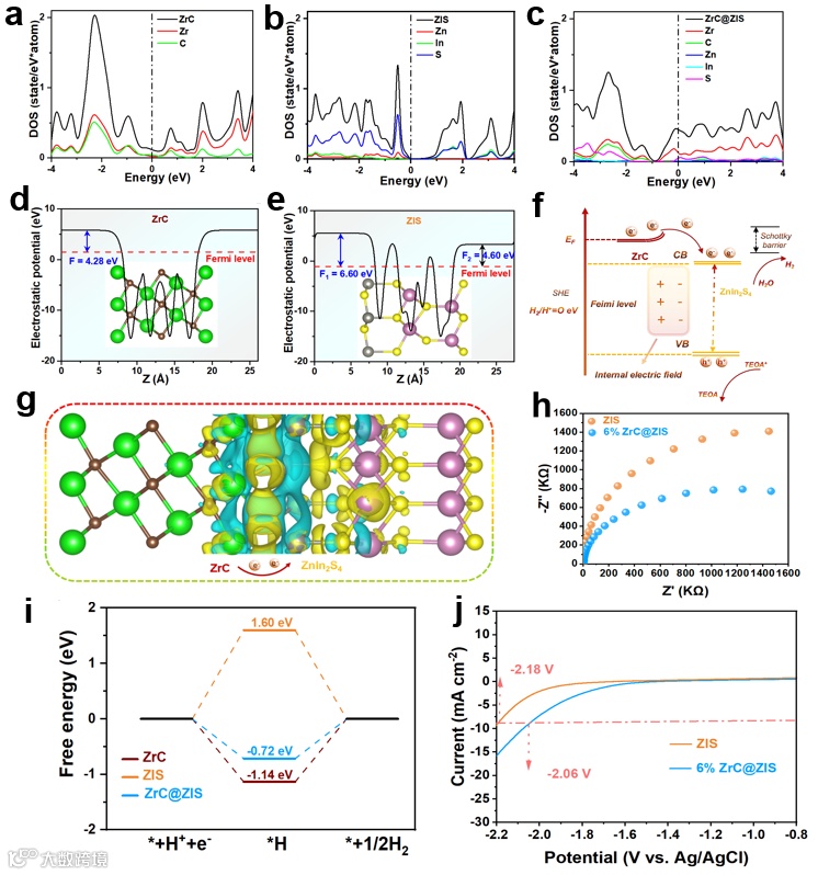 图6 (a)ZrC、(b)ZIS和(c)ZrC@ZIS异质结构态密度(DOS),沿z轴计算的(d)ZrC和(e)ZIS的静电势。(f)ZrC@ZIS异质结构的肖特基异质结图示。(g)ZrC和ZIS之间界面处的模拟电子密度分布。(h)ZIS和6% ZrC@ZIS异质结构的EIS图。(i)制备样品的HER自由能计算图。(j)ZIS和6%ZrC@ZIS异质结构的LSV曲线。