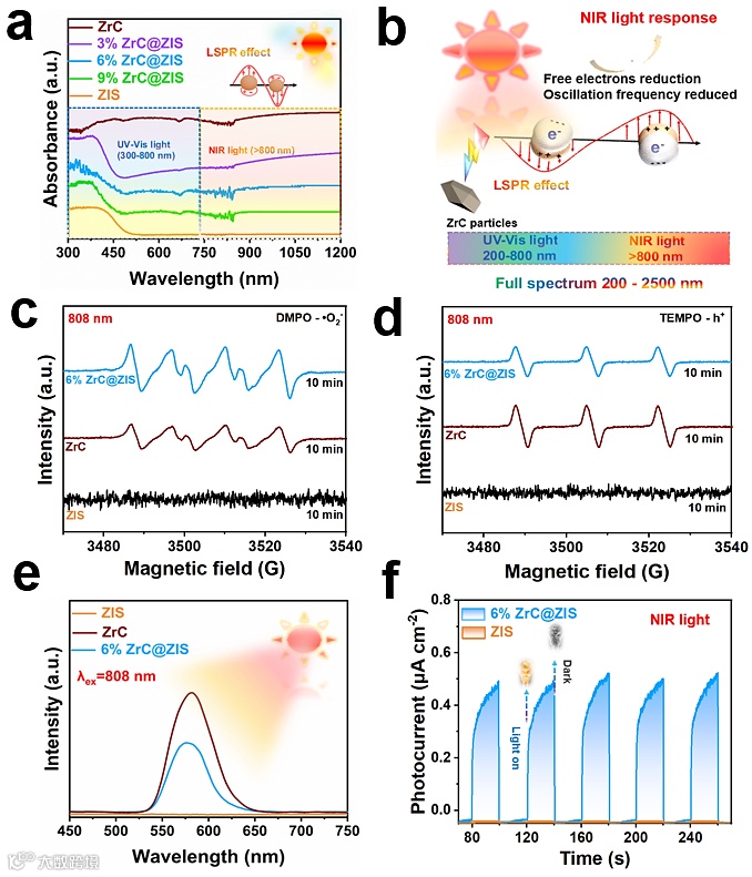 通过紫外-可见-近红外漫反射光谱(DRS)证实,由于金属ZrC的引入成功拓宽了ZIS的光吸收,ZrC@ZIS复合材料在750-830 nm范围内表现出广泛而强烈的NIR光波动,其独特的NIR响应主要来自金属ZrC的局部表面等离子体共振(LSPR)效应。在特定频率的光照射下,金属ZrC表面的自由电子与入射光共振,产生LSPR效应,大大减少了自由电子的数量,降低了振荡频率光对NIR光学区域的响应。此外,采用电子自旋共振(ESR)光谱以及光电化学表征证实NIR光照射下复合材料的光生电子-空穴对的复合速率不仅受到抑制,而且促进了载流子的产生,从而提高NIR光催化活性。