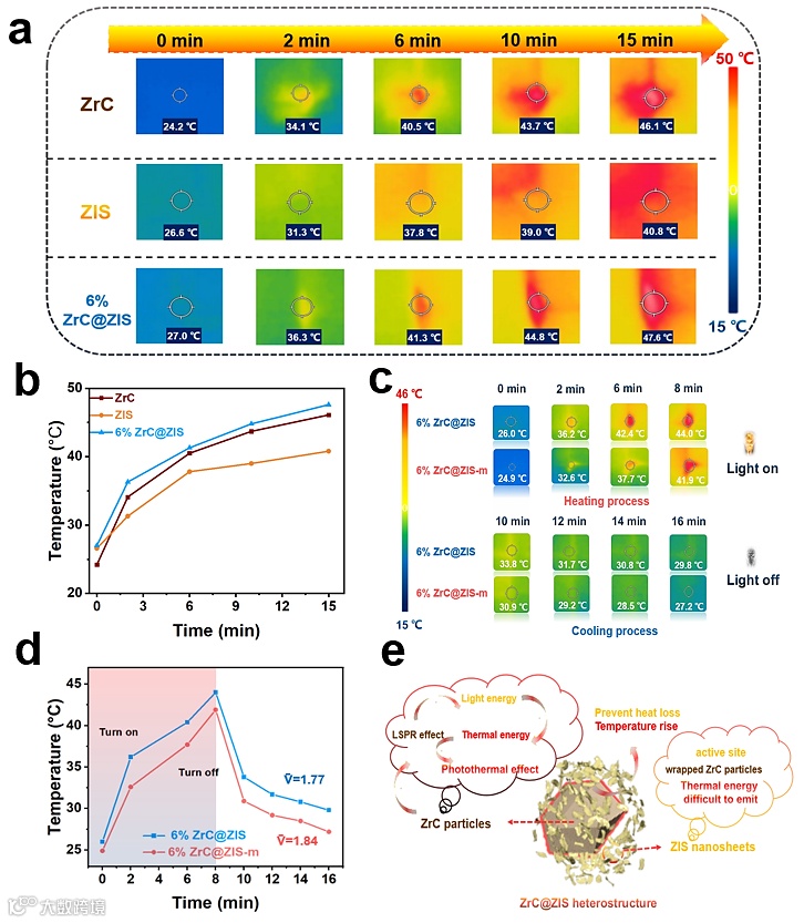 图5 (a,b)近红外辐照(λ > 800 nm)下ZIS、ZrC和6%ZrC@ZIS的光热映射图像及相应的温度变化曲线。(c)在开/关灯条件下近红外光照射下6%ZrC@ZIS和6%ZrC@ZIS-m的红外热图像和(d)相应的温度曲线。(d)ZrC@ZIS核壳异质结构光热辅助升温的示意图。