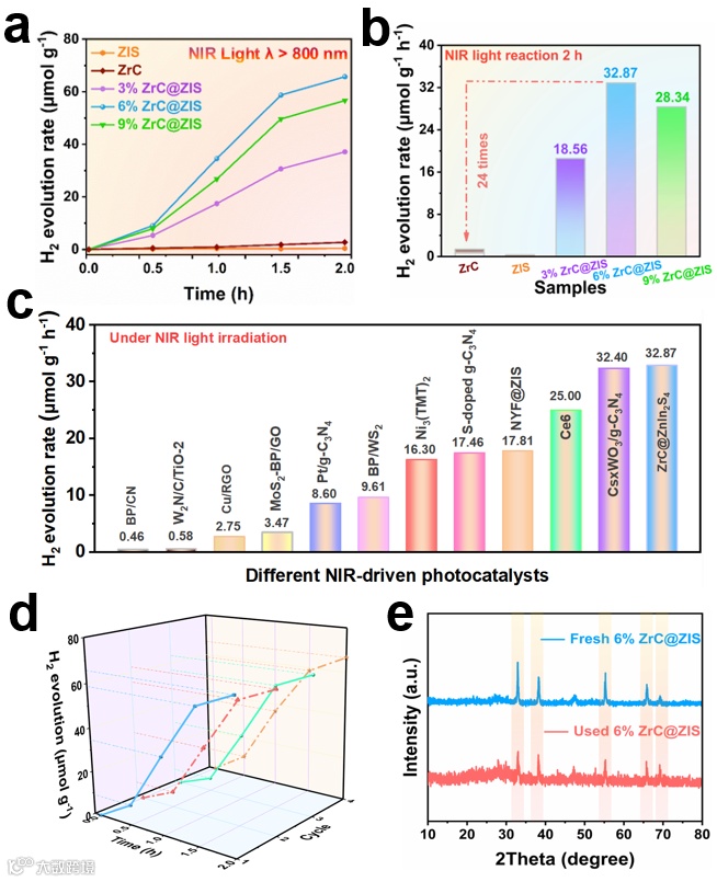 图2 ZrC、ZIS和ZrC@ZIS异质结构的NIR光催化产氢性能及稳定性测试。