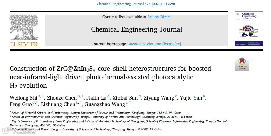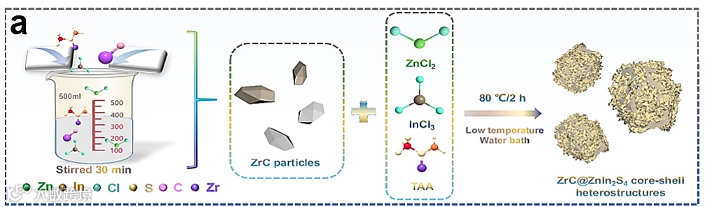 近日,来自江苏科技大学材料学院施伟龙和能源与动力学院郭峰副教授,在国际知名期刊Chemical Engineering Journal上发表题为“Construction of ZrC@ZnIn2S4 core-shell heterostructures for boosted near-infrared-light driven photothermal-assisted photocatalytic H2 evolution”的研究论文。该论文采用一步低温水浴法(图1)成功制备了ZrC@ZnIn2S4(ZrC@ZIS)核壳异质结构,将ZIS纳米片包裹在ZrC颗粒上,用于近红外辐照(λ>800 nm)光热辅助光催化制氢。光电化学表征和DFT计算证实,ZrC金属特性引发的LSPR效应不仅成功地拓宽了复合材料的近红外光吸收,而且ZrC与ZIS之间肖特基势垒的形成加速了光生载流子对复合材料的转移和分离。此外,核壳结构中金属ZrC的光热效应促进了光热辅助光催化析氢活性。