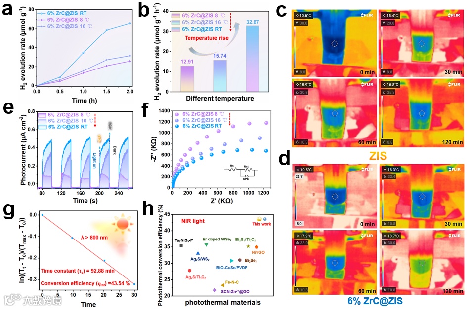 图4不同反应温度下(a, b)6%ZrC@ZIS异质结构的光催化析H2、(c, d)ZIS和6%ZrC@ZIS实际反应过程中的光热红外图像。(e, f)不同反应温度下6%ZrC@ZIS异质结构的电化学特性、(g, h)光热转换效率的计算与比较。