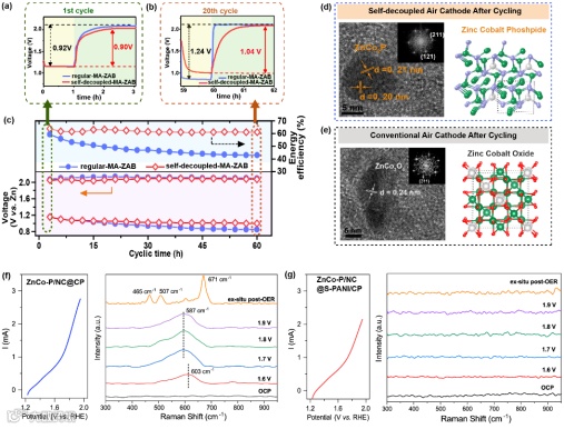 图5. “自解耦”弱酸性可充锌-空气电池(红线)和常规弱酸性可充锌-空气电池(蓝线)循环前后的(a-b)充/放电曲线以及(c)充电/放电电压和能量效率关系图。(d)ZnCo-P/NC ORR-part催化剂在“自解耦”弱酸性可充锌-空气电池循环后的TEM图像。(e)ZnCo-P/NC催化剂在常规弱酸性可充锌-空气电池循环后的TEM图像。(f)ZnCo-P/NC涂敷碳纸电极(ZnCo-P/NC@CP)和(g) ZnCo-P/NC涂敷S-PANI改性碳纸电极的OER极化曲线以及相应的原位拉曼光谱。