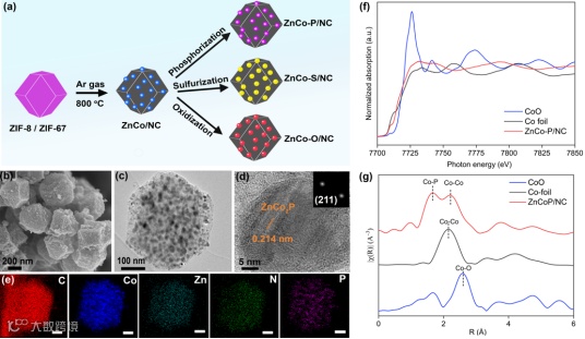 图3. (a)ZnCo/NCs催化剂的合成示意图。ZnCo-P/NC的(b)SEM图像、(c)TEM图像、(d)HR-TEM图像和(e)EDS-mapping图像。(f)ZnCo-P/NC、CoO和Co金属的Co K-edge XANES和(g)FT-EXAFS谱图。