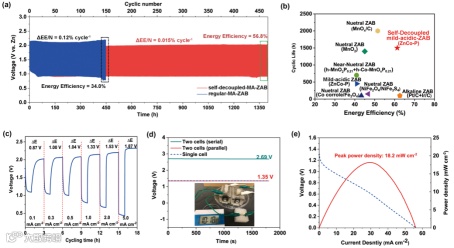 图6. (a)“自解耦”弱酸性可充锌-空气电池长周期循环曲线。(b)“自解耦”弱酸性可充锌-空气电池与已报到的中性/准中性可充锌-空气电池能效和循环寿命的比较。(c)“自解耦”弱酸性可充锌-空气电池的倍率性能。(d)单个、两个串联和两个并联的“自解耦”弱酸性可充锌-空气电池的开路电压。(e)“自解耦”弱酸性可充锌-空气电池放电极化曲线图及相应的功率密度。