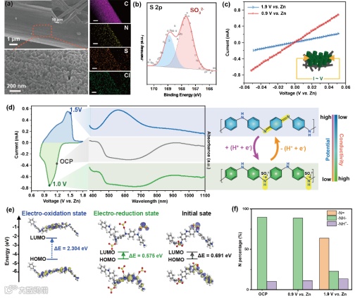 图2. (a)制备的S-PANI层的SEM图像和EDS-mapping图像。(b)S-PANI的高分辨率S 2p XPS谱图。(c)S-PANI/碳纸电极在0.9 V vs. Zn和1.9 V vs. Zn处理后的I~V曲线图。(d) S-PANI/ITO电极在不同电位的原位UV-vis谱及其相应的化学结构。(e)密度泛函计算得到的S-PANI分子在不同状态下的HOMO和LUMO轨道。(f)S-PANI在0.9 V vs. Zn、1.9 V vs. Zn条件下的N 1 s XPS比较图。