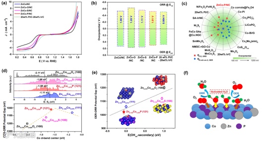 图4. (a)ZnCo/NCs催化剂在0.1 M PBS溶液中ORR和OER的线性扫描伏安图。(b) ZnCo/NCs和20 wt% Pt/C+20 wt% Ir/C混合物的双功能活性比较。(c)ZnCo-P/NC的双功能活性与文献中报道中性氧电催化剂的比较。(d)ZnCo/NCs中Co原子轨道投影态密度(PDOS)和d带中心位置,及其与双功能活性的关系。(e) ZnCo/NCs表面二次位点OH吸附能力与其双功能活性的关系。(f)表面"阴离子辅助水解离"机理示意图。