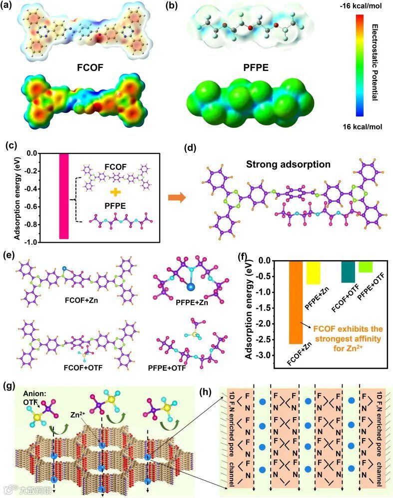 图3 理论计算分析FCOF、PFPE、Zn2+、OTF-各组分之间的相互作用以及Zn2+ 在 FCOF 一维孔隙内的传输示意图