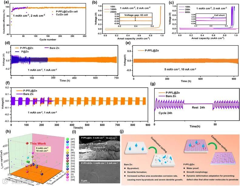 图5 (a) - (c) 半电池的CE性能;(d) - (e) 对称电池长期连续循环性能;(f) - (g) 对称电池长期间歇循环性能;(h) 性能对比;(i) 沉积形貌;(j) 机理说明