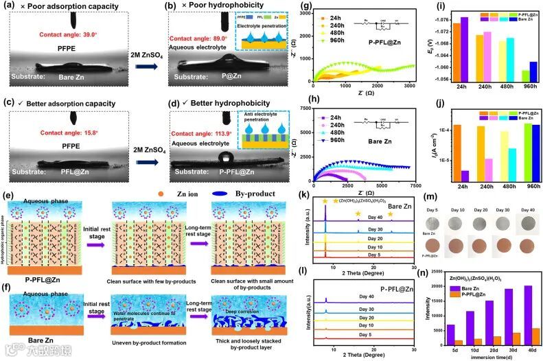 图4 P-PFL@Zn的疏水性能以及长达40 d内的静态防腐性能表征