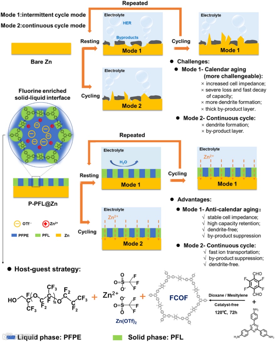 图 1. 富氟固液界面(P-PFL)的制备过程以及在两种循环模式下P-PFL@Zn 的抗日历老化机制示意图
