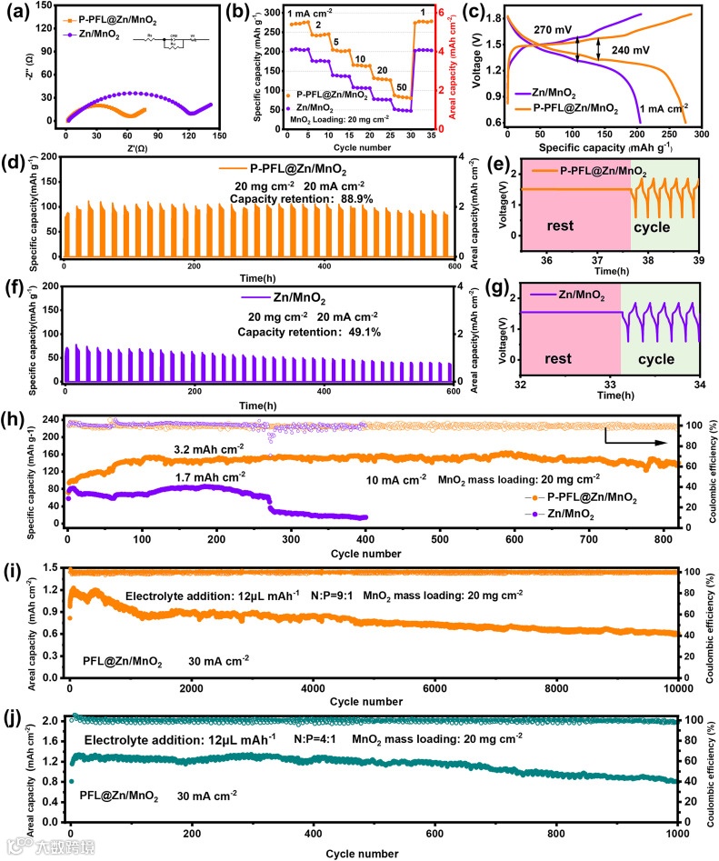 图6 (a) 全电池阻抗比较;(b) 倍率性能;(c) 充放电曲线;(d) - (f) 间歇循环模式下全电池循环性能;(h) 连续循环模式下长循环性能;(i) - (j) 有限锌用量下的长循环性能