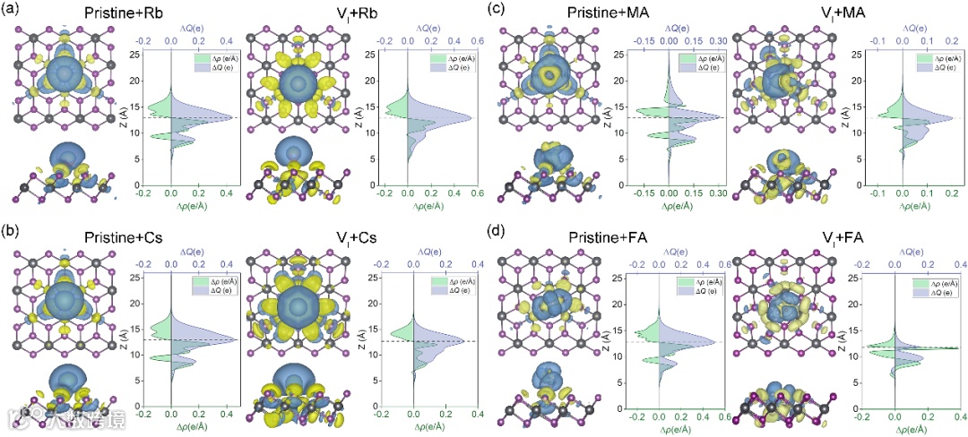图3. 阳离子和PbI2表面的电荷密度差异图。