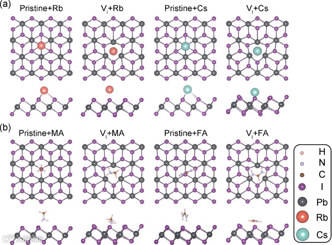 图2. 四种A位阳离子吸附在PbI2(完美体系或带有单碘空位缺陷)表面上的弛豫结构。