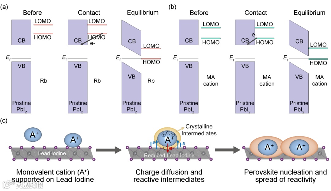 A位阳离子吸附在PbI2表面上是钙钛矿成核过程中形成中间体的第一步。阳离子的带电状态和相互作用的强度是影响钙钛矿薄膜生长速率和质量的关键因素。该研究类比了Cabrera 和 Mott提出的金属低温氧化理论,提出观点:对于PbI2界面上方A位阳离子的吸附,存在一个反应界面电场,该电场可以诱导类似的封装/氧化,从而促进OLHPs中间加合物的形成。这种钙钛矿生长机制应该更可能通过生长钙钛矿的两步法实现。