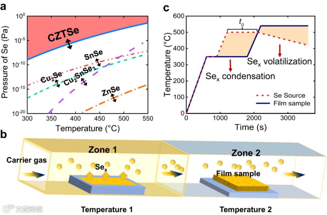 图1. 固-液/固-气协同反应策略。(a) CZTSSe以及相关二次相的硒气温相图;(b) 双温区硒化设备示意图;(c) 固-液/固-气硒化反应加热程序示意图。