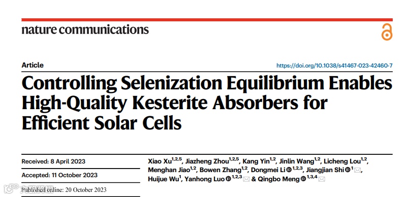 近日,中国科学院物理研究所孟庆波团队,在国际知名期刊Nature Communications上发表题为“Controlling Selenization Equilibrium Enables High-Quality Kesterite Absorbers for Efficient Solar Cells”的文章。该文章提出了一种固-液/固-气(固体前驱体和液/气硒)协同反应策略来精确控制硒化过程。通过预先沉积充足的液态硒,为硒化反应初期提供了高的硒化学势,以促进铜锌锡硫硒Kesterite相的直接且快速的形成。进一步协同优化硒的冷凝和随后的挥发过程有效地去除了有机化合物残留,从而改善薄膜中的电荷传输。最终,基于此方法获得了13.44%的小面积铜锌锡硫硒太阳能电池的认证效率(0.26 cm2),并创造了一项 1cm2 铜锌锡硫硒太阳能电池认证效率世界纪录(12.1%),被收录在太阳能电池之父马丁•格林(Martin Green)编辑的 最新Solar Cell Efficiency Tables [Versions 62]。