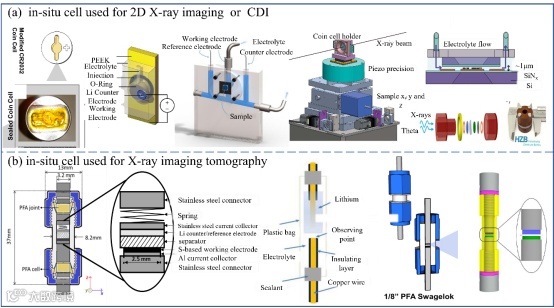 X射线成像实验可分为非原位(ex-situ)和原位(in-situ operando)两大类型。Ex-situ样品是外部原位准备的样品,从电池中取出并在惰性气氛下维持其性质,然后进行测量。这种方法易于准备,但电池的拆卸会中断材料的演化,对工作条件下的信息收集不利。In-situ/operando实验在电池研究中更常见,测量过程在电池运行时进行,反映了样品的真实情况。然而,大型商业锂离子电池的体积限制了实验室的实施,因此需要特殊设计的电池,同时兼顾电池功能和X射线实验可行性。这些in-situ电池设计的关键要求包括X射线透射性、气密封、机械稳定性以及小型化。最常用的in-situ电池设计有适用于2D成像的硬币电池形式以及适用于3D层析的Swagelok形式。这些要求确保了电池能够提供对X射线的通透性,同时在测量过程中保持稳定。整体电池尺寸非常小,以获得可接受的信噪比和对比度。