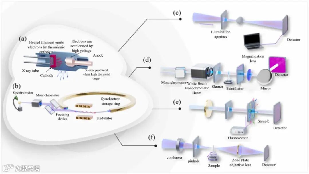 图1. 实验室X-ray光源和同步辐射X-ray光源,以及目前主流的X射线成像技术示意图。