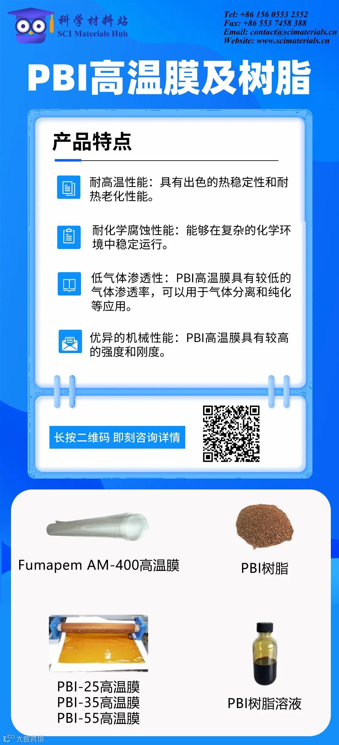 如果您对PBI高温膜有任何疑问或需要进一步了解,请随时与我们联系。我们的团队将竭诚为您提供支持和解答。官网微信:SCI-Materials-Hub,官方邮箱:contact@scimaterials.cn
