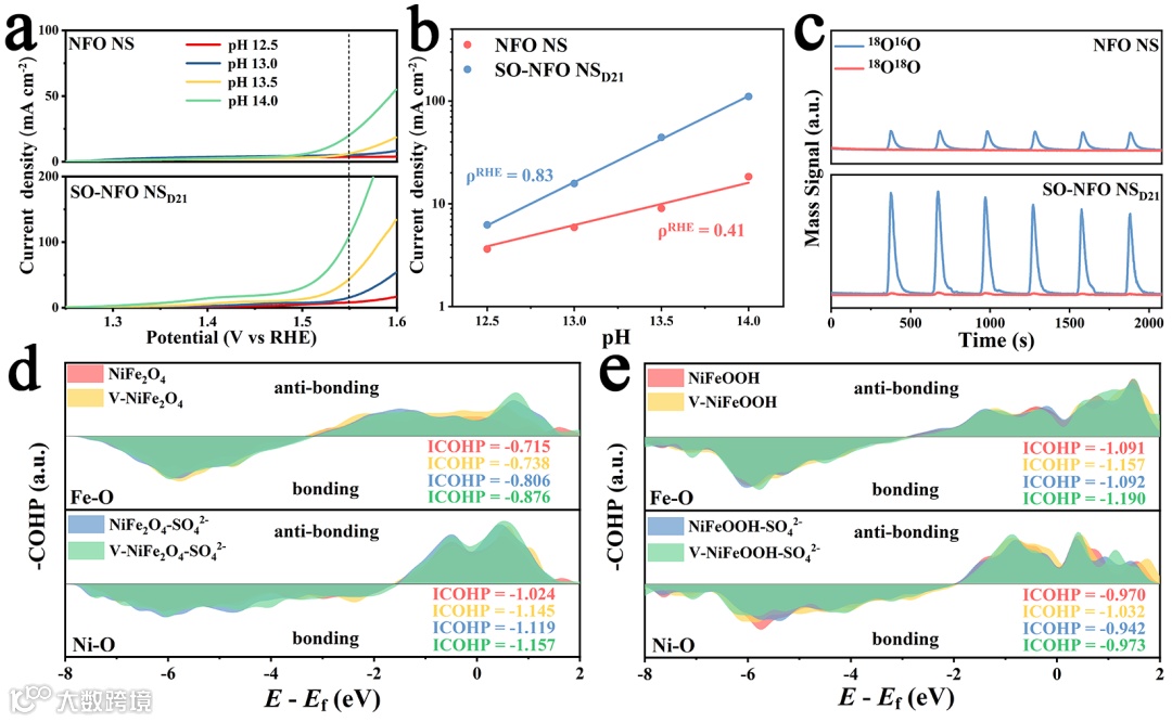 要点三:经质子-电子转移动力学研究与18O同位素标记原位微分电化学质谱测试表明,硫酸盐引入导致的八面体位点调控使NiFe2O4电极的OER过程从质子-电子协同转移步骤转变为非质子-电子协同转移步骤,促进NiFe2O4内晶格氧被激活并通过LOM路径参与电化学反应。