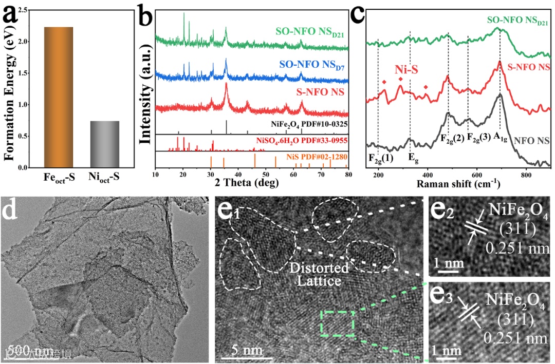 要点一:通过控制过渡金属硫化物在尖晶石NiFe2O4上的自发空气氧化,于NiFe2O4八面体位点原位生长硫酸盐。在硫酸盐与Ni阳离子之间的强电子相互作用下,NiFe2O4表面八面体位点中Ni阳离子失去电子,从而形成可在自然环境下保持稳定的Ni4+阳离子。另一方面,硫酸盐的引入同时引发周围NiFe2O4晶格发生扭曲,使八面体位点中产生丰富的晶格缺陷,并制得高含量的Ni空位。通过Ni4+阳离子与Ni空位的共同引入,NiFe2O4八面体位点的电子与晶体结构得到有效调控,从而优化其作为OER活性位点的反应路径。