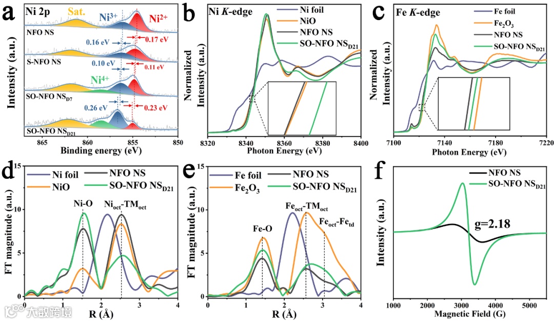 图2. 硫酸盐引入对尖晶石NiFe2O4表面化学态与电子结构的影响。