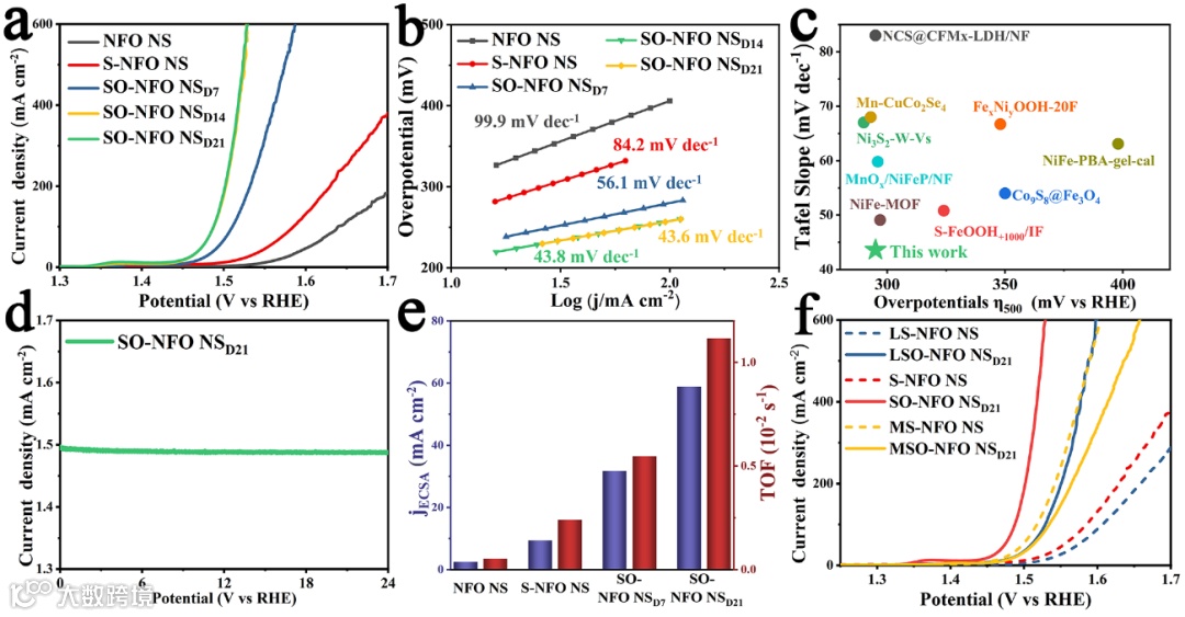 要点二:基于表面硫酸盐形成导致的八面体位点调控,NiFe2O4电极在OER测试中的电化学性能随空气氧化的进行逐步提升,在2周氧化后其性能趋于稳定并达到最优活性。制得电极于500 mA cm-2的电流密度下的过电位仅为293 mV,Tafel斜率仅为43.8 mV-1,远优于初始NiFe2O4电极。经换算,硫酸盐的引入使NiFe2O4的本征OER活性提升至原先的21.29倍。